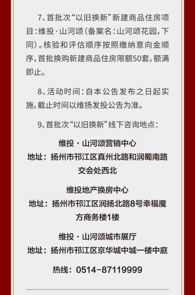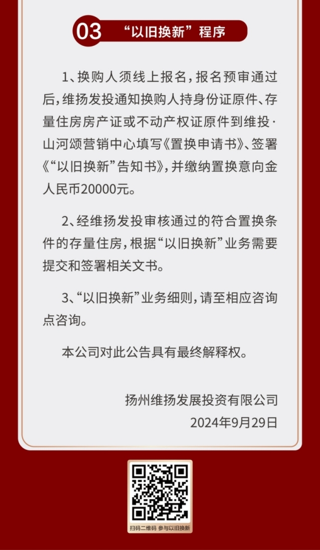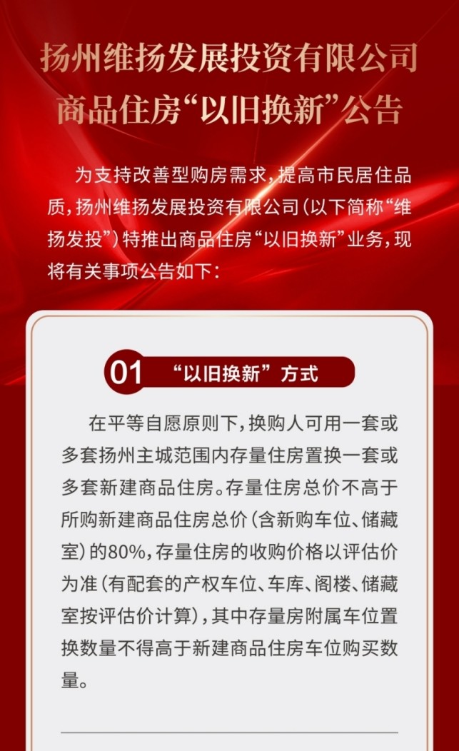 作為國企,維揚發(fā)投積極響應政府新推行的“以舊換新”政策,此次以其自主開發(fā)的維投·山河頌項目為試點,由國企背書、置換范圍廣、全流程專業(yè)服務。自公布“以舊換新”消息以來,維投地產(chǎn)線下三個“以舊換新”咨詢地點人氣持續(xù)爆棚!前來咨詢的購房者絡繹不絕。維投地產(chǎn)在開盤前就擺出誠意,給足買房人信心。通過“以舊換新”,買房人可以直接置換明月湖畔聯(lián)排別墅,改善一步到位!目前首批推出的換購新建商品住房限額50套“以舊換新”登記即將接近尾聲,感興趣的買房人抓緊時間辦理申請。