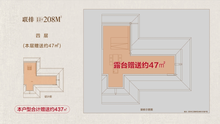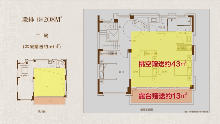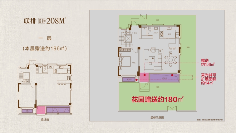 208戶型鑒賞: 大花園:戶均擁有約120㎡以上私屬庭院,可打造花園、茶室或親子活動(dòng)空間,延伸生活詩意 三開間:約10.7米南向面寬,首層層高約3.6 米,采光通風(fēng)俱佳,營(yíng)造朗闊起居格局。 高附贈(zèng):地下室面積約108㎡,約 5.5 米挑高,可隔成兩層,打造影音室、健身房、酒窖等多元功能區(qū);一層餐客廳挑空,可拓展約43㎡贈(zèng)送空間;二層、三層配備景觀露臺(tái),陽臺(tái)半贈(zèng)送;四層星空露臺(tái)全贈(zèng)送,解鎖生活多重想象。